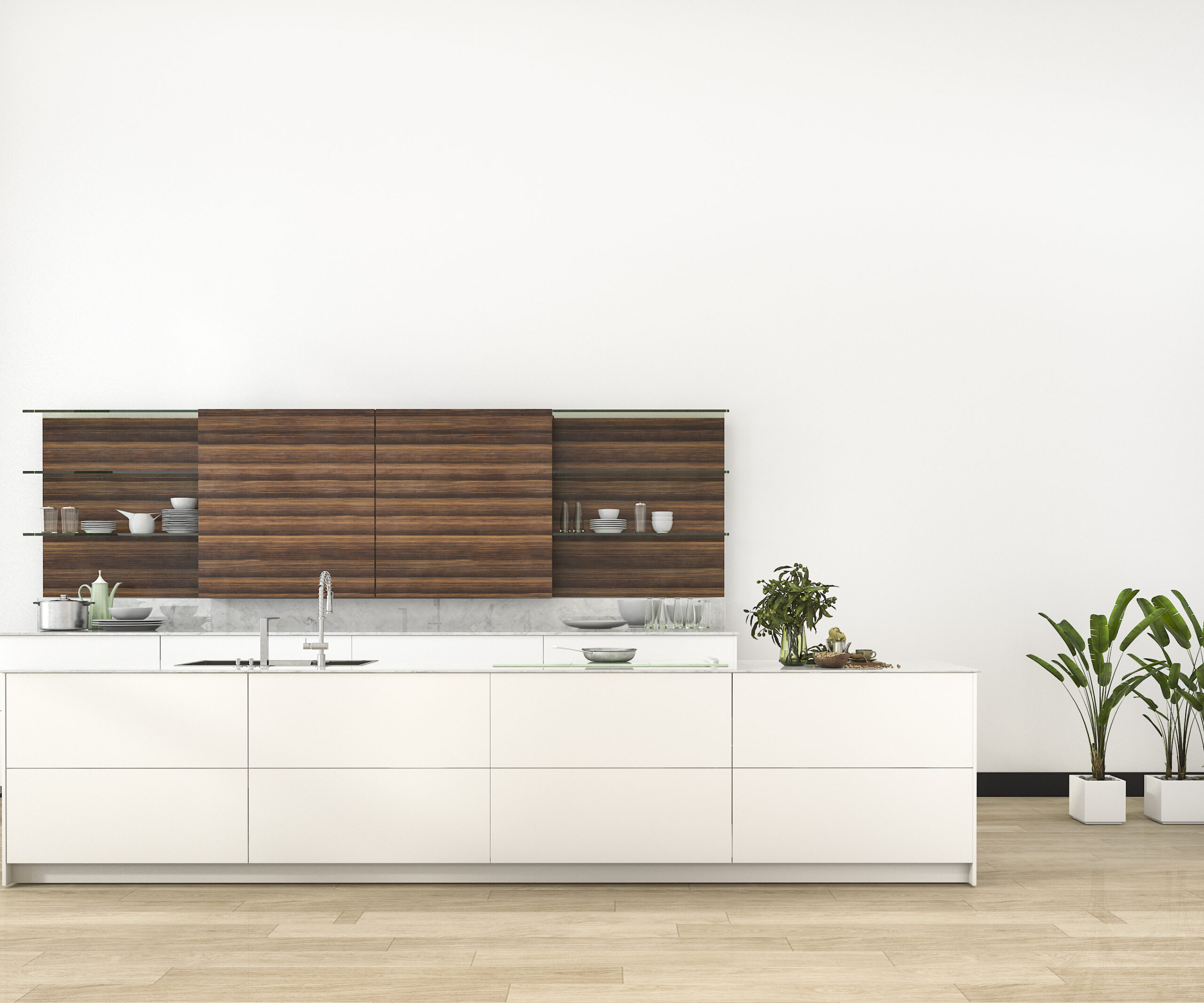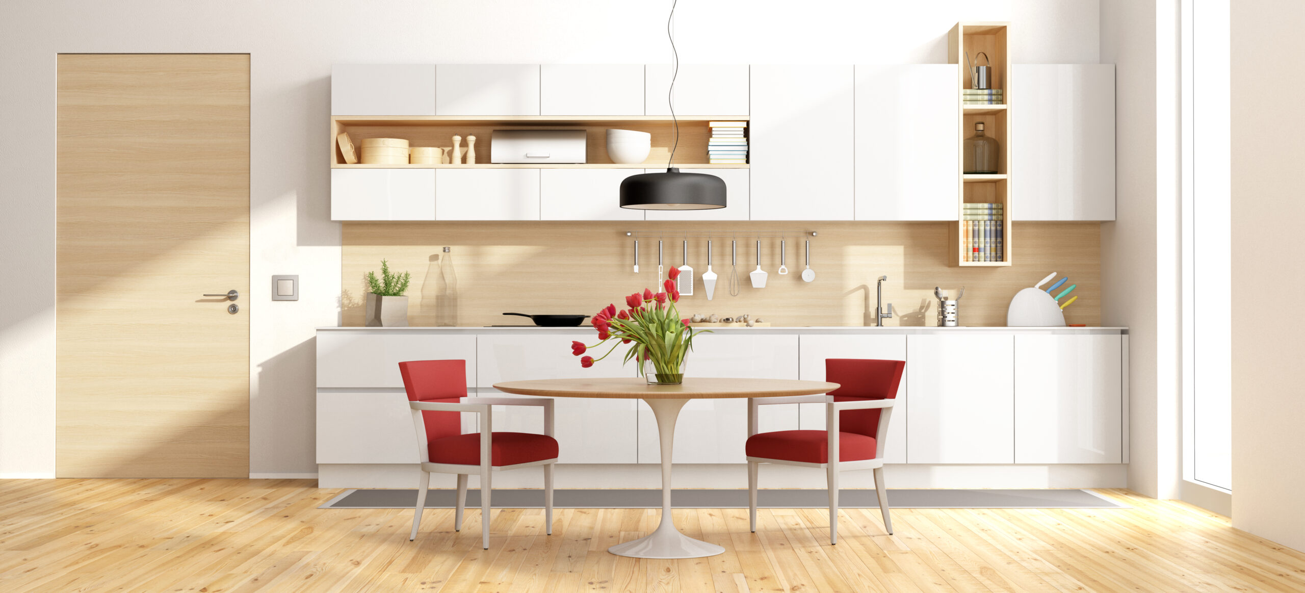 White and wooden modern kitchen with round dining table and chairs - 3d rendering