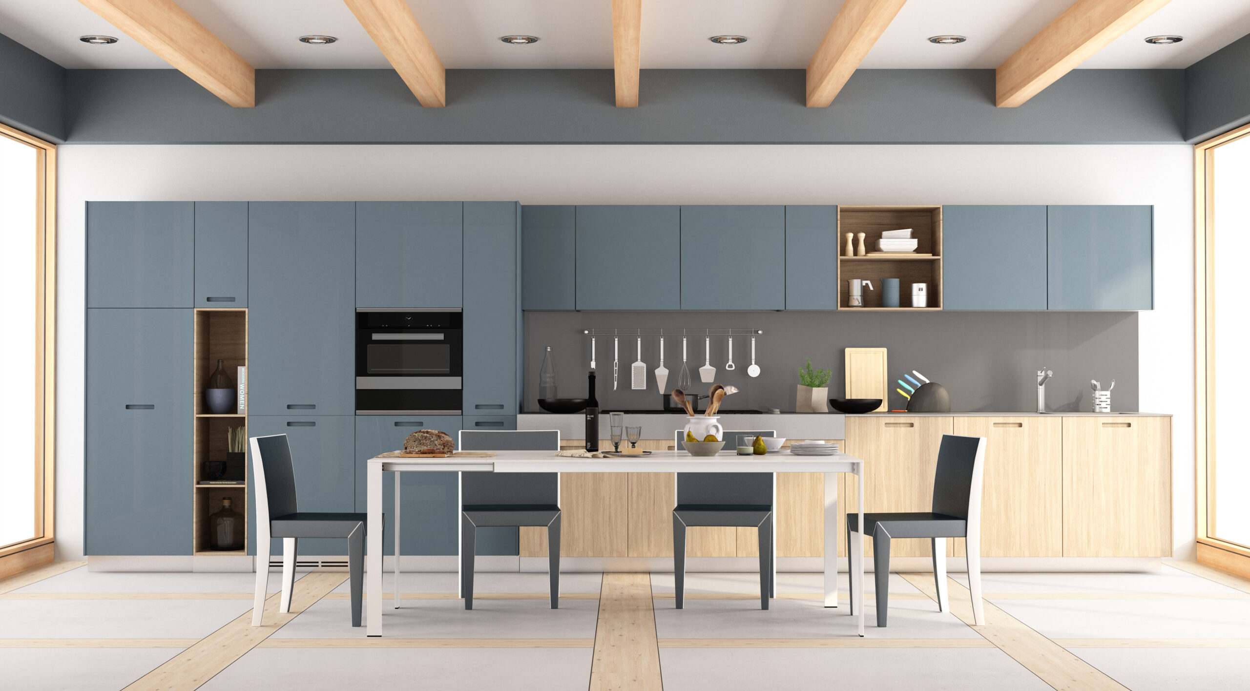 Modern wooden and blue kitchen with dining table and chairs - 3d rendering